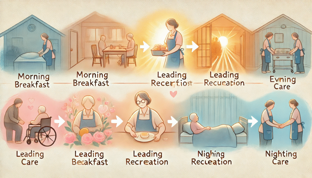 特養は、要介護度が高く24時間体制の支援が必要な方が多く入居している施設です。介護福祉士は、夜勤を含むシフト制で勤務し、入浴・食事・排せつ・就寝介助などの生活支援を行います。入居者数が多いため、チームでの連携が不可欠です。勤務中は複数の利用者を担当することが多く、的確な判断力とスピードが求められます。夜勤では夜間の体調変化に気づく観察力が特に重要になります。