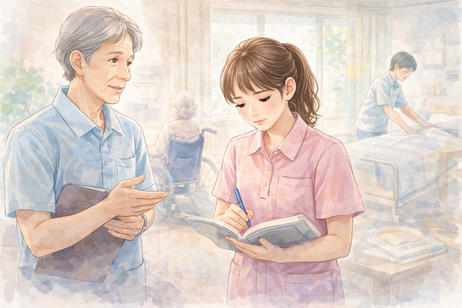 介護の仕事を始めたばかりの新人にとって、最初の3か月は人生の中でもっとも学ぶことが多い時期です。利用者さんの名前や顔、性格、生活歴、身体状況を覚えるだけではなく、施設のルール、人間関係、記録の書き方、報告の順番など、頭の中がいっぱいになる要素で溢れています。 この期間は、「覚える量」>...