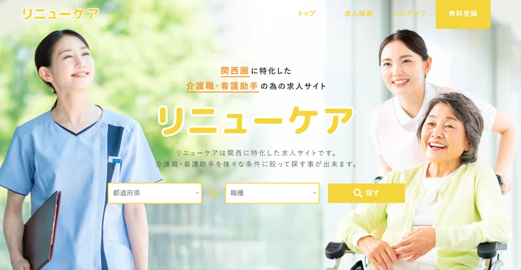 リニューケアは、介護職や看護助手など、介護・福祉業界に特化した関西エリア専門の転職支援サービスです。