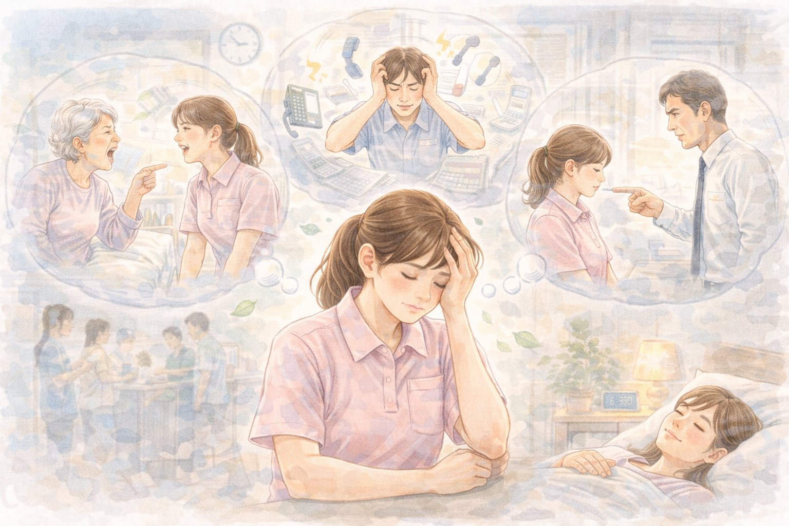 • 多重課題:ケア・記録・家族対応・申し送りが同時に迫る“四面楚歌”状態。